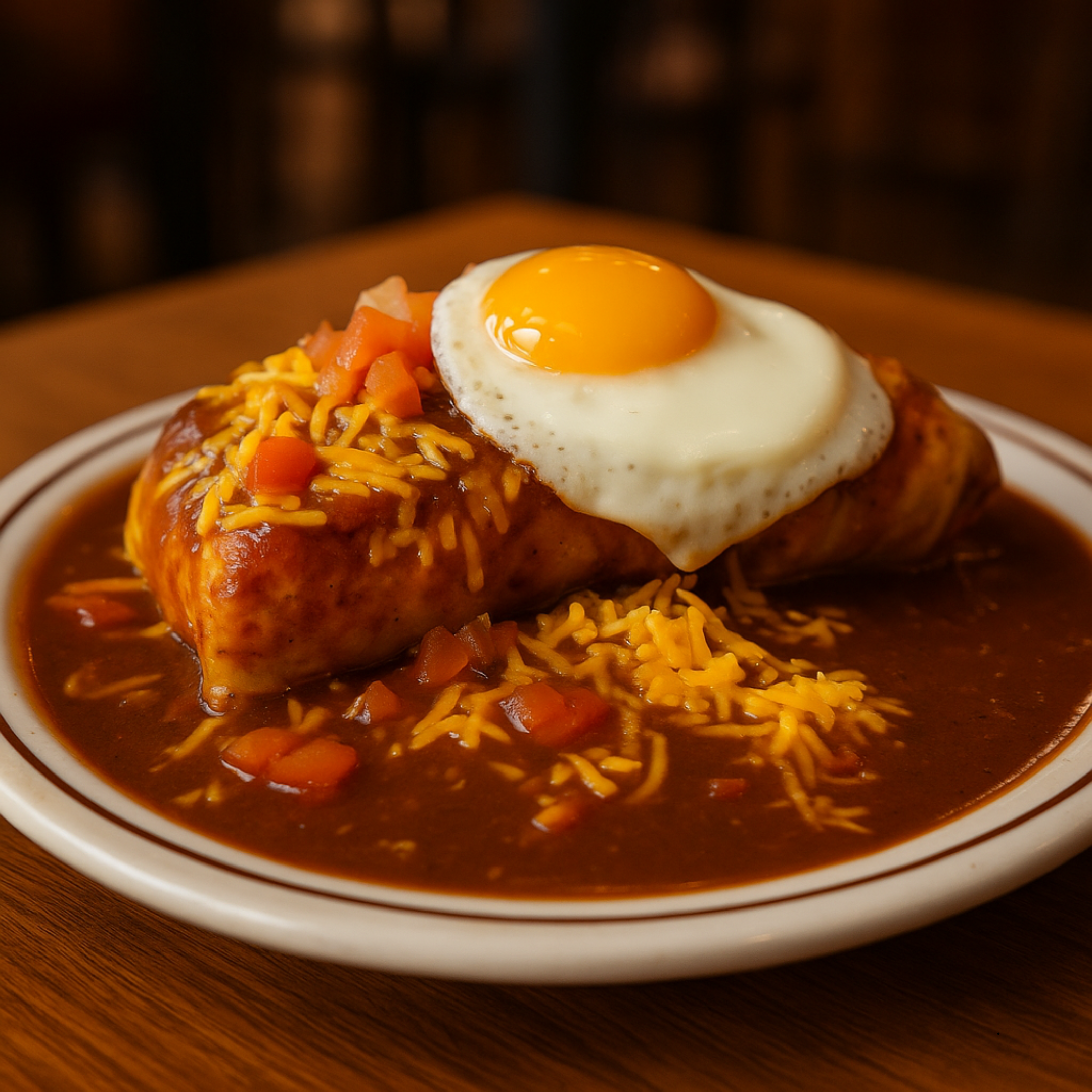 A signature Denver, Colorado, diner dish consisting of a breakfast burrito stuffed with hash browns and ground beef, smothered in cheese and chili (typically green chili or chili con carne). It is a long-standing local comfort food often featuring a combination of savory breakfast items and spicy toppings.